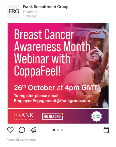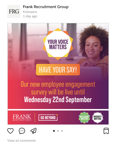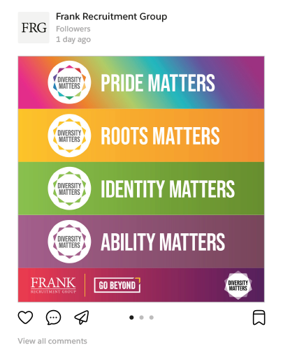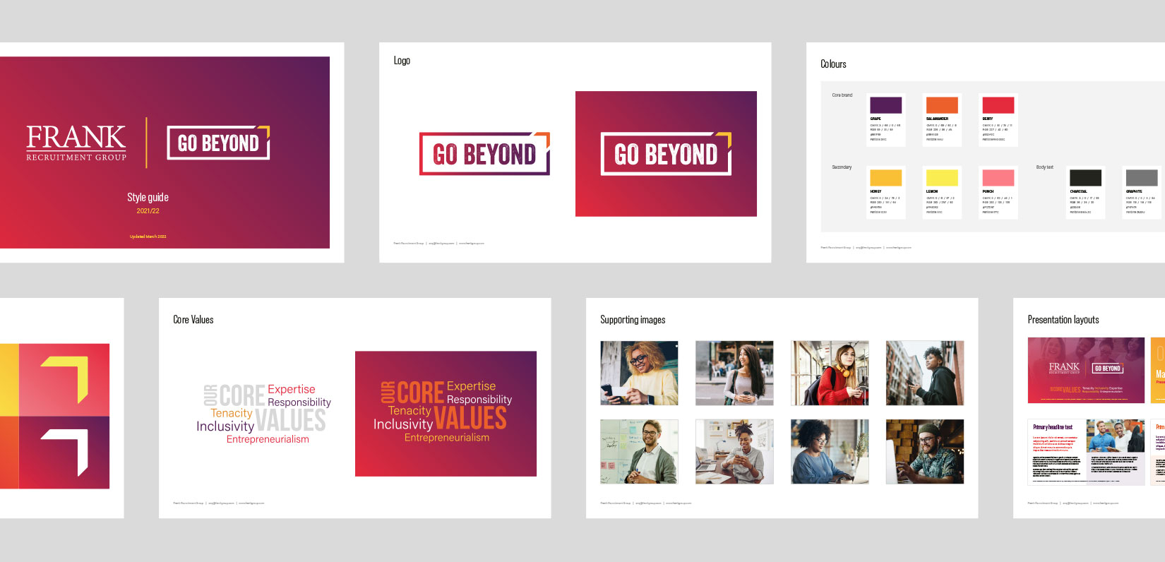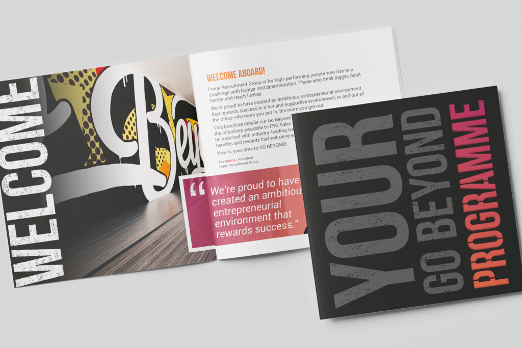 Go Beyond is the internal employee-brand programme for Frank Recruitment Group. After the core logo was developed by an external agency, the wider identity needed a refresh to reflect a more people-centric, optimistic culture. Drawing on insights from a company-wide employee survey, the brief called for a vibrant visual system that would inspire existing staff and attract new talent.